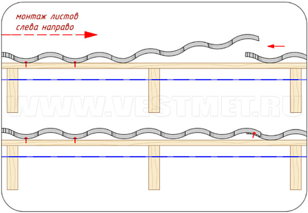 Монтаж металлочерепицы можно проводить как слева направо, так и справа налево. Главным критерием выбора направления является удобство монтажа. Начинают со стороны, где нет необходимости обрезать лист. При монтаже справа налево следующий лист накрывает крайнюю волну предыдущего. При укладке слева направо следующий лист подкладывается под предыдущий.