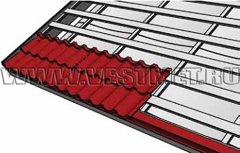 Устанавливать первый лист следует с отступом от торца кровли, величина которого определяется по формуле, приведенной ранее. Фиксируют его со стороны начала монтажа, оставляя свес на карниз. Его укладывают на обрешетку, временно закрепляя саморезом в верхнем левом углу под ступенькой профиля в месте примыкания обрешетки. |