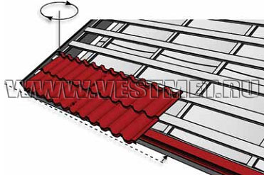 Листы монтируют под прямым углом к карнизам. Перед началом работ необходимо проверить, ровная ли поверхность кровли, ее размеры по диагонали, прямолинейность конька и карнизов. При возникновении затруднений следует обратиться в отдел технической поддержки.