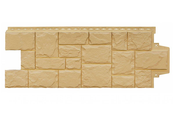 Фасадные панели Grand Line из коллекции Крупный камень выглядят как кладка грубо отесанного булыжника. Ее рисунок усложнен, неритмичен. Поверхность — с собственным рельефом, текстурой. Швы окрашены в тон к «камням». При облицовке панелями дополнительно используются наружные углы с таким же оформлением.