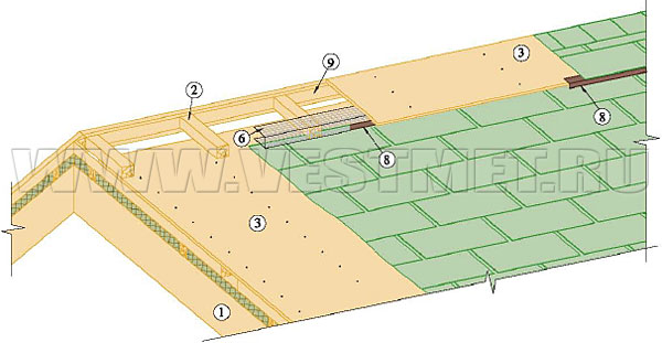 Между стропилами укладывают пародиффузионную мембрану «Дифбар» (5) и теплоизоляцию (4).