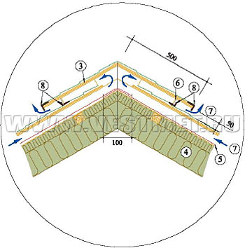 Чтобы воздух при вентиляции подкровельного пространства двигался в правильных направлениях (7), на торцы стропильных балок набивают ряд брусков 50х50 мм, располагая их перпендикулярно стыку скатов.